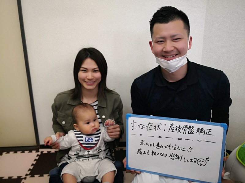 育児中の体のしんどさや痛みも無くなり毎日快適に育児が出来ていて本当に助かっています♪姿勢も抱っこが多いと猫背になったり肩こりもしてましたがこれもスッキリ!一心さんで施術を受けて背骨も骨盤も美しく整いました!整骨院って男性の先生が多くて行きにくいものだと思っていましたが、一心さんは女性のスタッフさんが多くて安心です♪これからしっかり体のメンテナンスのために通院していい状態の自分をキープしていきたいと思います!これからもよろしくお願いします^_^